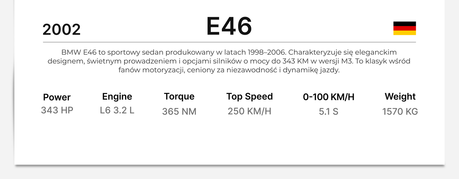 Na dole plakatu znajdziesz podstawowe informacje o Twoim modelu: krótki opis, moc silnika, waga, i inne kluczowe detale.